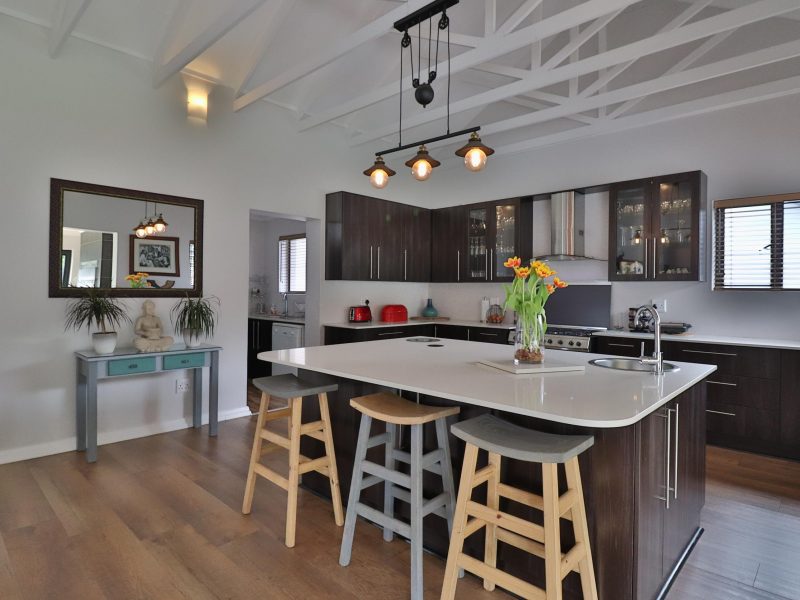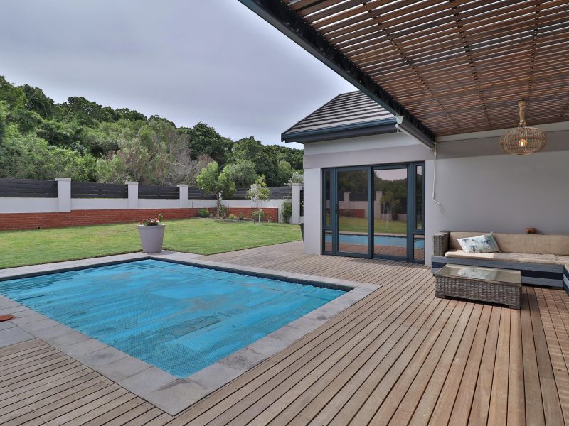 All that is expected of modern, secure and upmarket lifestyle estate living! Beautifully fitted and well designed open plan spaces, high volume and airy. Living spaces flow seamlessly to entertainment areas. Wind free Braai area opening to fabulous covered deck and pool area. Gorgeous established garden with fully enclosed yard, perfect for kids and pets. Wonderful feeling of flow, function and relaxation. Live side by side with nature. The full lock up and go package. Take a virtual tour.